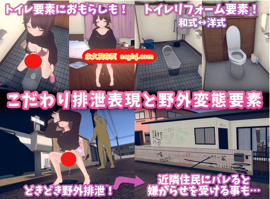 根据时间推移和饮食状况,女主角会进行排泄行为。如果来不及上厕所,还可能尿裤子…。此外,在浴室内也可以直接排尿…。