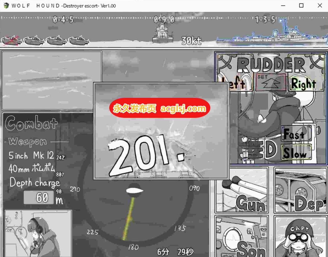 大致流程 用声呐探测目标→对准船头追踪→靠近后测量深度并调节深水炸弹→依靠声呐在 U 型潜艇正上方投放深水炸弹(U 型潜艇上浮时,靠近后进行炮击,过近则无法炮击)