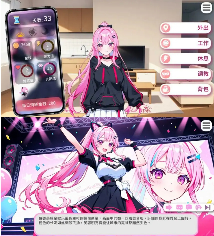 相处中,你将通过日常互动、对话选择逐步了解桃香,帮助她面对来自演艺圈与个人生活的压力,并建