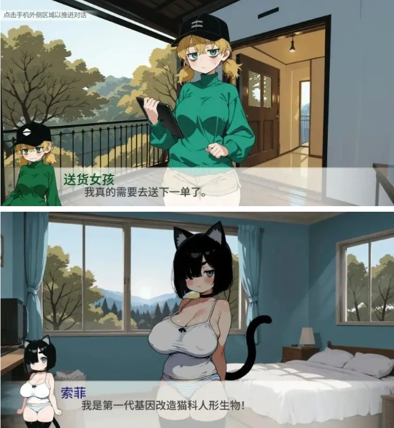 好感互动系统:通过多种互动方式(抚摸、喂食、赠送礼物)培养与猫娘索菲的感情,推动剧情发展。