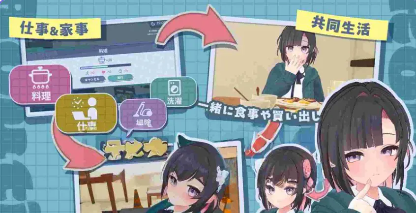 通过共同料理、打扫、洗衣等家务互动培养默契。玩家从事远程工作,可自由安排日程,