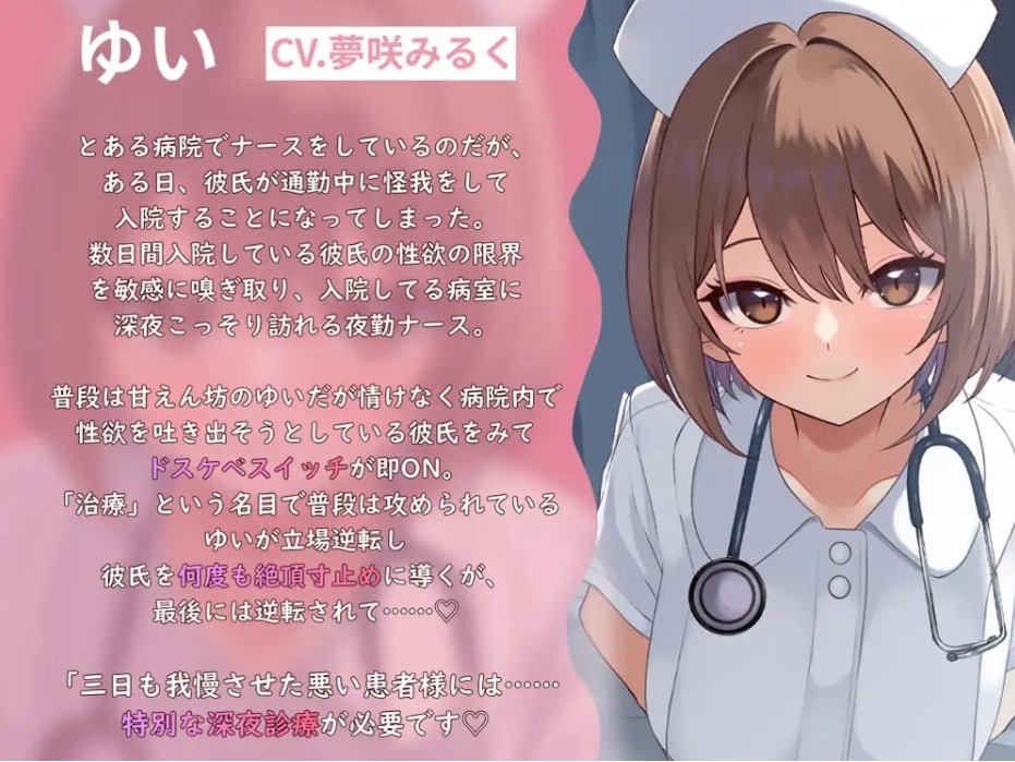 深夜,以值班护士身份来到病房的结衣,一边呢喃着“这是治疗哦……♡”,一边开始了不为人知的夜间诊疗。
